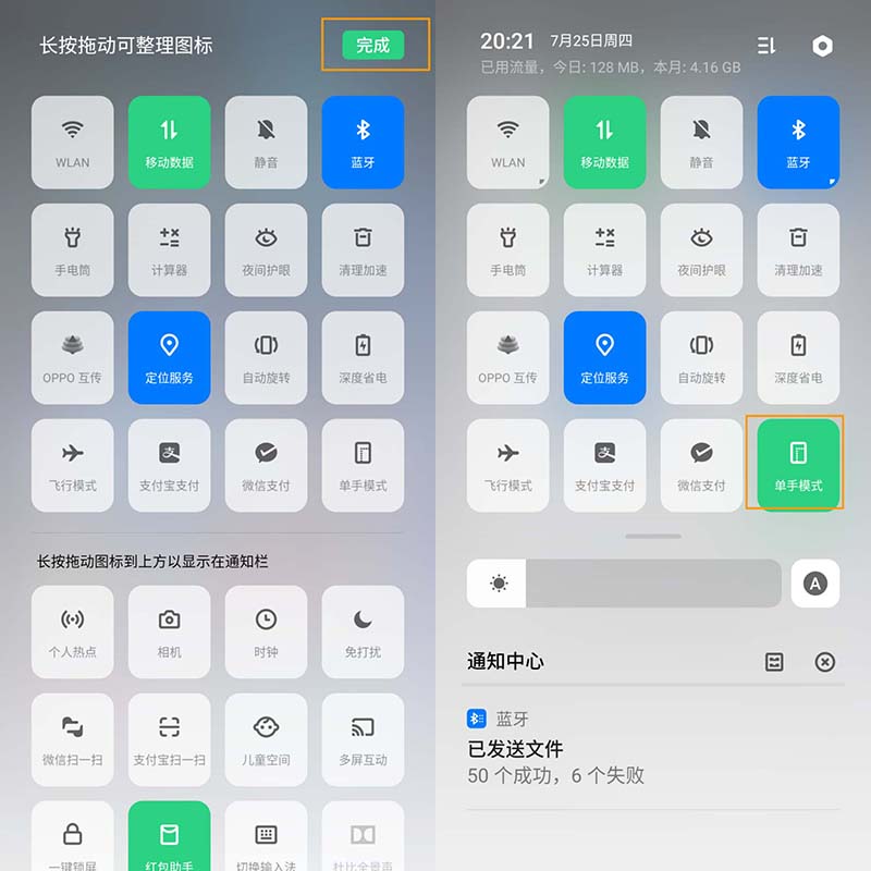 2、添加后,点击右上角【完成】,再下拉通知栏点击【单手模式】即可使用,如下图: