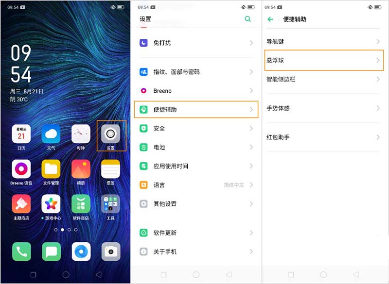 1、通过桌面【设置】--【便捷辅助】--【悬浮球】。