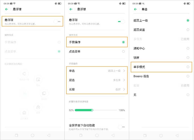 2、打开【悬浮球】开关--点击【手势操作】--选择相应的手势,这里以【单击】为例,点击进入--找到【单手模式】勾选即可,后续想进入单手模式,单击悬浮球即可进入。