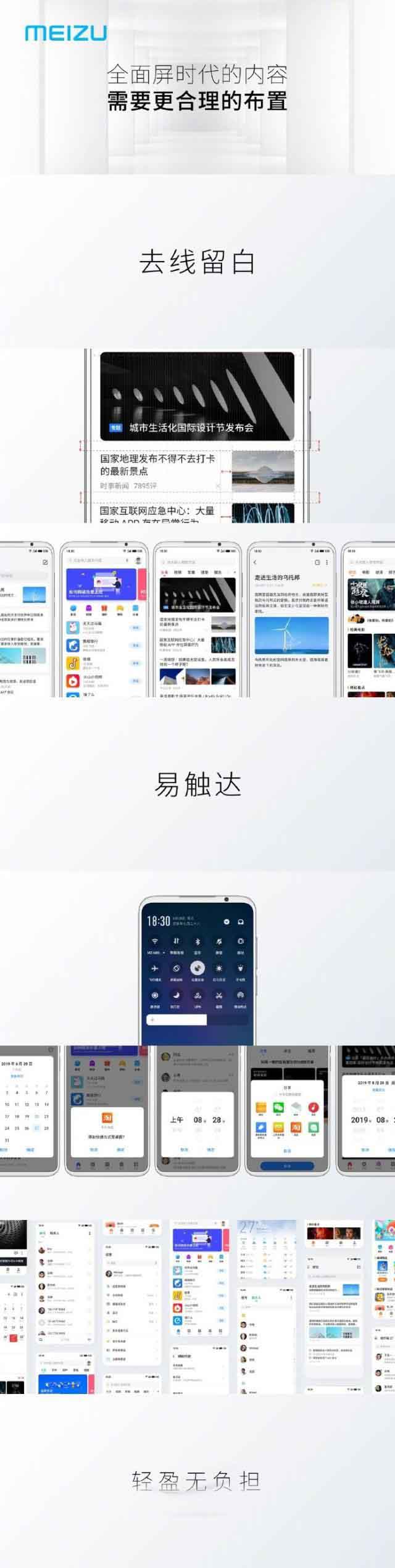 Flyme8采用去线留白结合全局下沉设计,全新的栅格体系,调整字号、字重、行间距等,使得字里行间简洁和规整,常用内容做了位置优化,手指更易触达。
