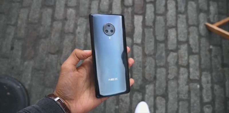背面,NEX 3 采用的圆形相机设计,三摄被放置在一个黑色的圆形区域内,vivo 曾表示该设计的灵感来源于手表;在靠近底部的位置,则是 NEX 的 Logo。