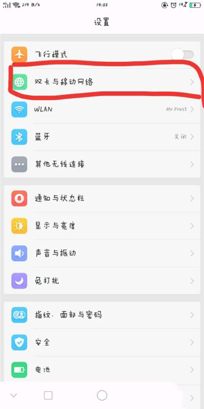 1.打开oppoa9手机【设置】,点击【双卡与移动网络】