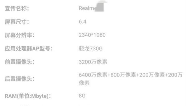 曝光的图片虽然对产品名称进行了涂抹,但依然可以猜测,国内版本依然会叫realme XT。realme XT将采用一块6.4英寸的屏幕,屏幕分辨率为1080P。前置3200万像素摄像头,后置四摄,主摄像头为6400万像素,其他依次为800万像素、200万像素和200万像素。