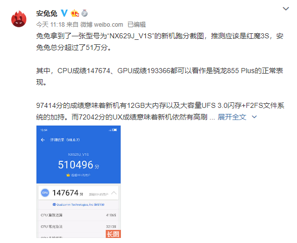 跑分截图显示,该机得到的总分为510496分,其中CPU的成绩为147674分,GPU成绩为193366分。红魔3S已经明确表示将采用骁龙855 Plus移动平台,得到这个分数也属于正常水平。而MEM成绩为97414分,这个分数非常不错,应该会有一些新技术的加入。最后UX的分数为72042分,不出意外的话,红魔3S将会使用一块高刷新率的屏幕。