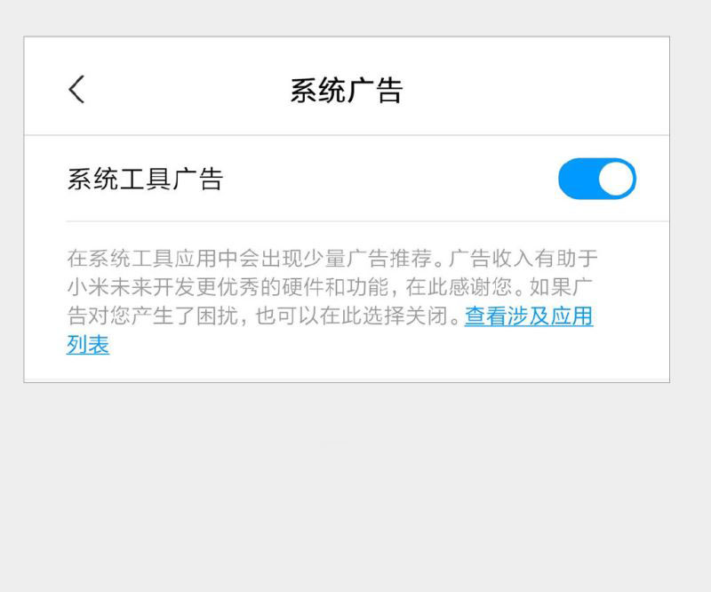 有人觉得适当的广告能接受,但也有人表示不愿意看到任何广告。对此,小米也是挺纠结的。眼看手机市场竞争越来越激烈,小米也开始妥协,允许用户关闭MIUI广告。在MIUI 10的最后一个开发版中,有一个特别的功能——一键关闭MIUI所有系统工具广告。MIUI体验负责人表示,三个月前,他们的团队开始全面对系统广告进行整治,并做了大量工作,到今天为止体验已有非常大的改善。这个功能在完善中,将随下一个大稳定版本铺到所有支持的机型上。只要把这个开关打开,就能一键关闭手机里面所有的广告,MIUI从此恢复清爽。具体路径为:系统设置-小米账号-隐私协议等-系统工具广告。(需要升级到MIUI10开发版9.8.29及之后的版本)
