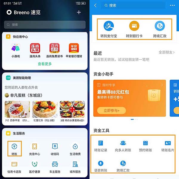 3、如需要转账、点击转账就可以直接进入转账页面进行各种转账操作了。