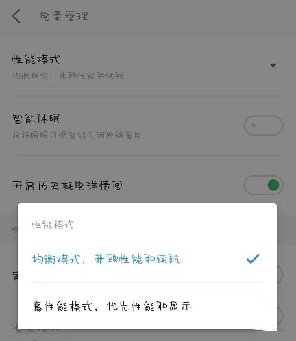 2、打开【设置】-【电量管理】-【右上角设置符号】,点击性能模式,看是不是勾选均衡模式,如果不是请勾选均衡模式。