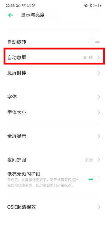 3、找到【自动息屏】选项,点开会发现自动息屏时间有15秒、30秒、1分钟、2分钟、5分钟、10分钟、30分钟等多个选择,接下来您就可以根据自己的需求选择适合自己的自动息屏时间了。