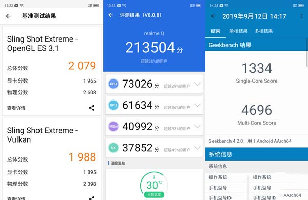 通过专业跑分软件测试,realme Q的安兔兔跑分成绩为213504,属于骁龙712处理器的正常水平。GeekBench4单核得分1334、多核心4696。