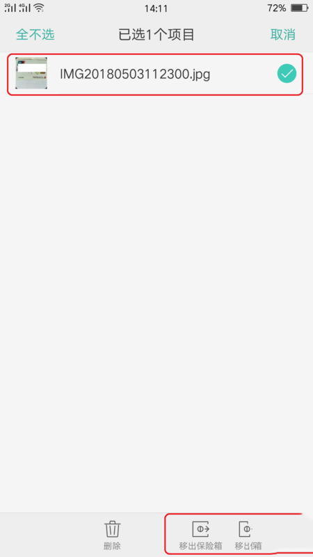 5、进入以后,将要解除隐藏的照片勾选上,然后点击移出保险箱,这样就可以将照片解除隐藏状态了。