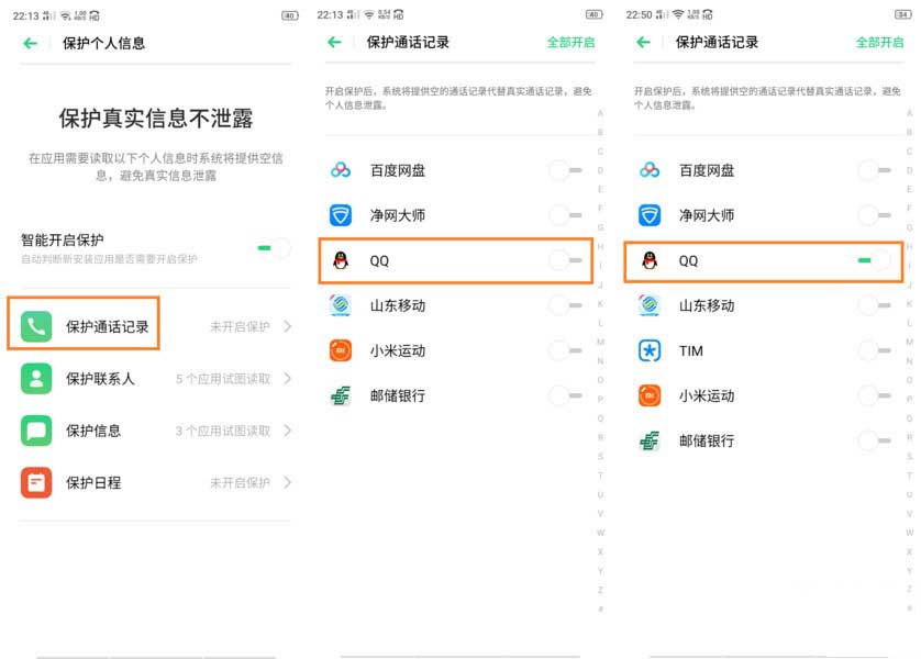 2、点击「保护通话记录」,选择需要保护的应用,开启即可;