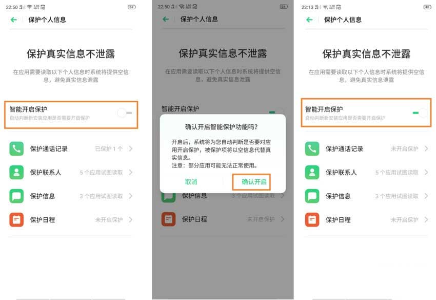 3、打开「设置-安全-保护个人隐私-智能开启保护」,开启此功能后,系统将自动判断新安装的应用是否需要保护,免去每一次手动设置的烦恼。