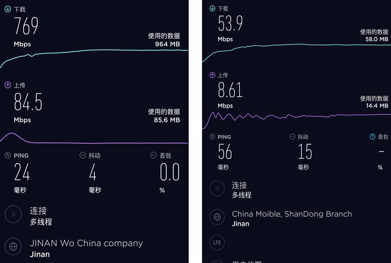 可以看到,中国联通5G网络情况下,iQOO Pro 5G的速度实测下行速率达到769Mbps,上行速率达到了84.5Mbps;移动4G速度实测下行速率为53.9Mbps,上行速率则是8.61Mbps。