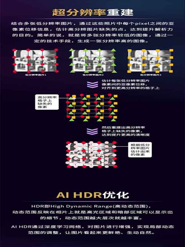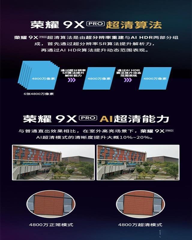 荣耀9xpro超清算法是由超分辨率重建与AI HDR两部分组成,首先通过超分辨率SR算法提升解析力,再通过AI HDR算法提升动态范围表现。与普通直出效果相比,在室外高亮场景下,荣耀9xpro AI超清模式的清晰度提升大概10%至20%。