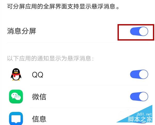 4、往右滑动按钮,打开消息分屏开关,即可允许该应用分屏。