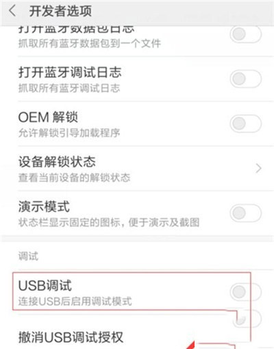 7、在开发者选项的下边开启USB调试功能,或者使用数据线连接电脑的时候弹出来一个菜单点击开启也可以。