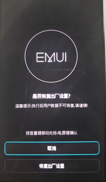 2、通过音量键上下移动进行选择,通过电源键选定“恢复出厂设置”。