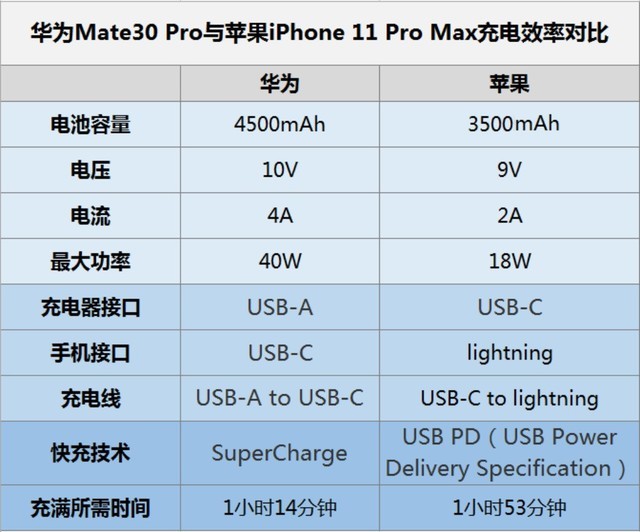 从今年两家新品标配的充电器看,此次运用在Mate30系列中的40W快充早已广泛应用在华为P系列、Mate系列旗舰机上;而苹果才刚刚标配18W,低价版本依然不配拥有。