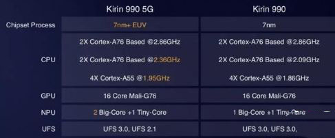 麒麟990(5G)和麒麟990之间差异,麒麟990的5G版本,使用了7nm+EUV的工艺,并且在CPU上,还进一步进行了提升,比如提升了A76的性能,中核心比麒麟990更大的主频效果,达到了2.38Ghz!