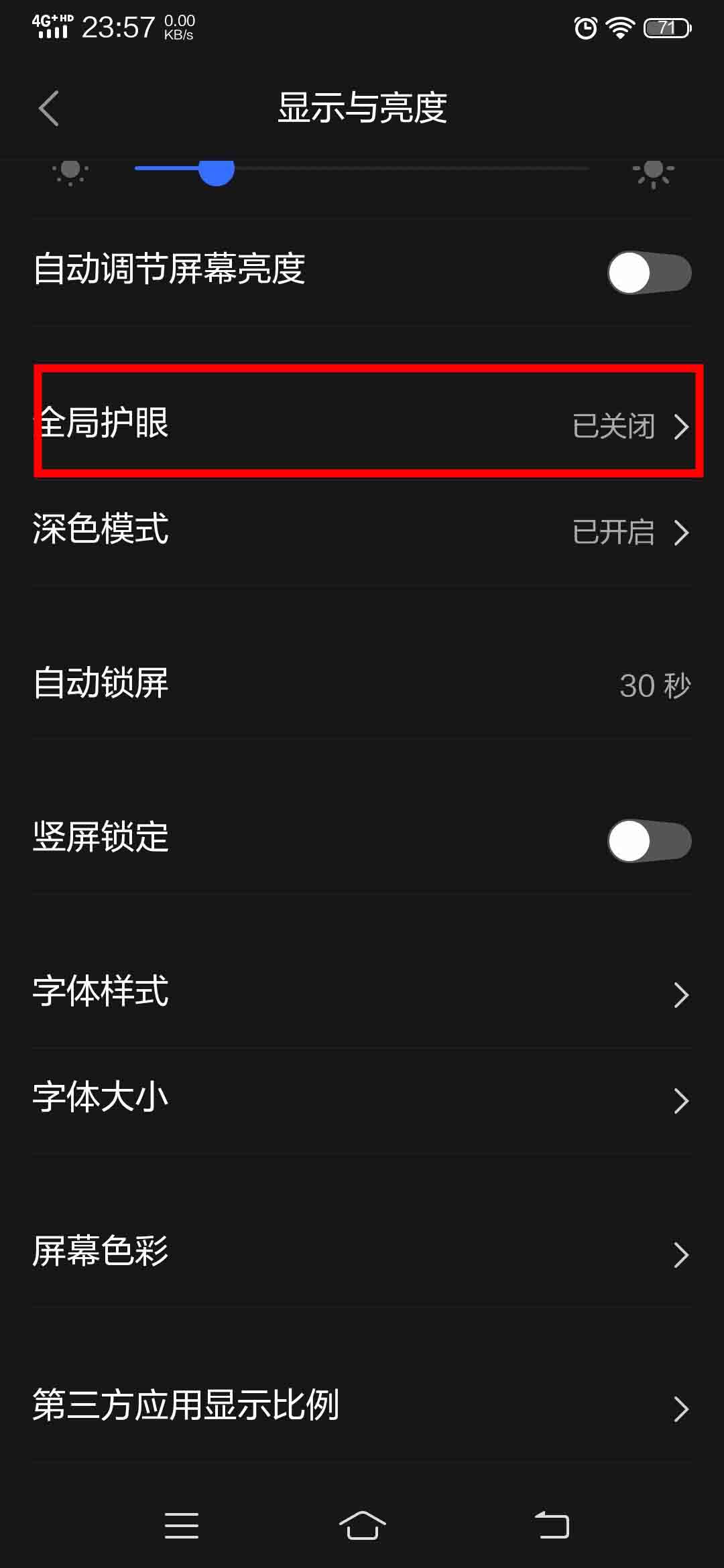 3、在显示与亮度菜单下点击打开【全局护眼】,