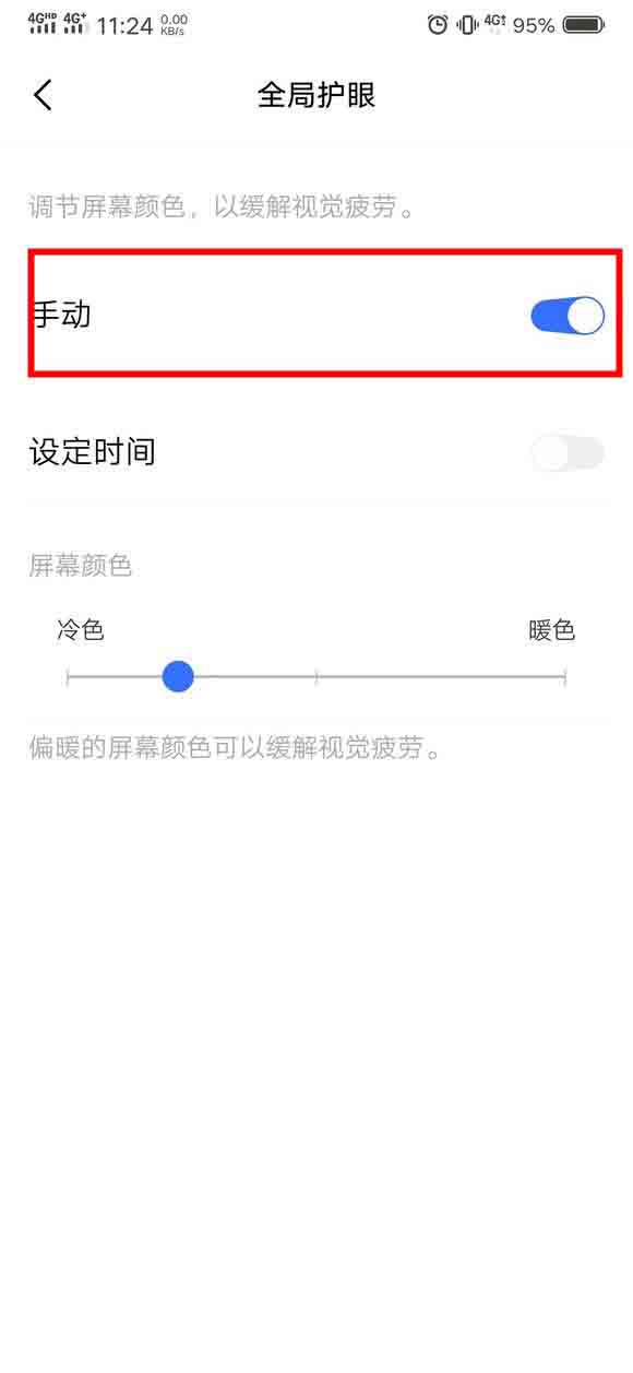 4、最后点击打开【手动】右侧的开关即可马上打开护眼模式,还可以拖动下面色调条上的滑块来调节屏幕色调!