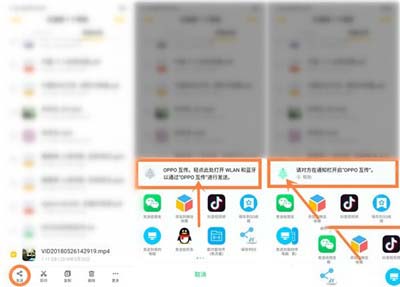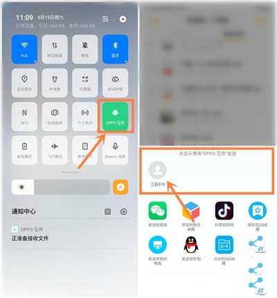 2、在接收文件的手机端,下拉菜单中点击 oppo 互传快捷按钮图标开启 oppo 互传功能,开启 oppo 互传功能时会开启手机 WIFI 和蓝牙开关,这是oppo 互传必须用到的权限,请勿关闭。然后会在发送文件的手机端使用 oppo 互传发送位置自动出现传输对象,触摸头像即可申请向该对象发送文件。