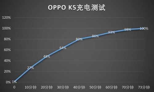 值得一提的是,OPPO K5还搭载了4000mAh大容量电池与全新的VOOC 4.0闪充技术,它采用定制 MCU 充电管理芯片,配合 BMS 电池管理芯片,以低电压高电流的方案提高充电功率,支持边冲边玩。小编实测发现,OPPO K5的电量从1%充至100%(充电完成状态)仅需73分钟,可谓非常迅速。