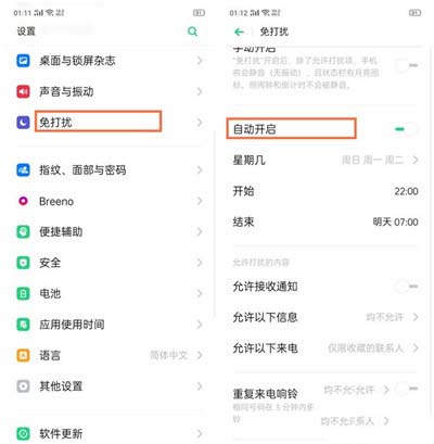 2、自动开启模式:设置—免打扰—自动开启,选择自动开启日期、开始和结束时间即可。