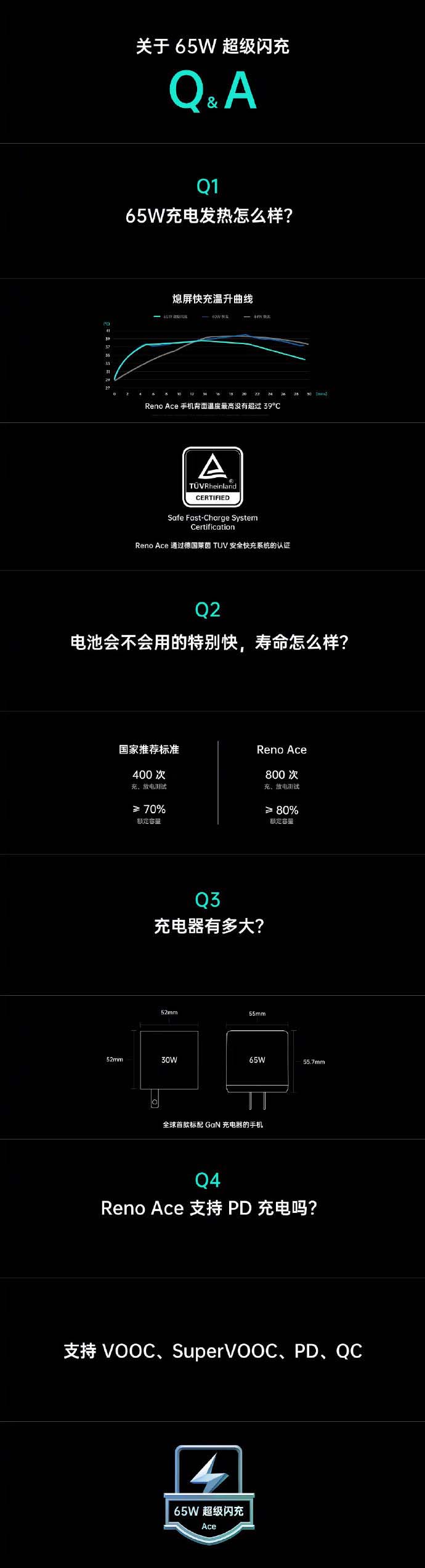 关于65W SuperVOOC超级闪充的发热,OPPO表示熄屏充电整个过程中,OPPO Reno Ace手机背面的温度最高没有超过39°C。此外,官方称Reno Ace通过德国莱茵TUV安全快充系统的认证,非常的安全可靠。
