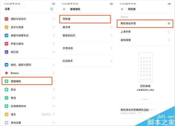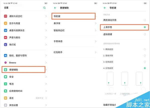 oppo Reno Ace的基础导航操作共有三种方式:「虚拟按键」「两侧滑动」和「上滑手势」。导航手势设置路径:设置——便捷辅助——导航键 。