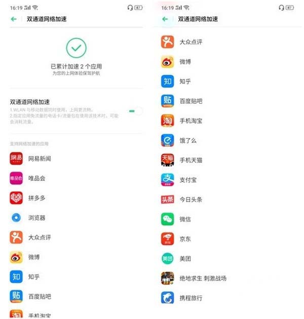 双通道网络加速:同时开启无线网络与移动网络,系统智能整合网络传输回来的数据包,帮助应用提升数据加载速度,大量文字及图片的新闻类应用提升显著。(温馨提示:开启后,会使用您的数据流量,产生资费。)