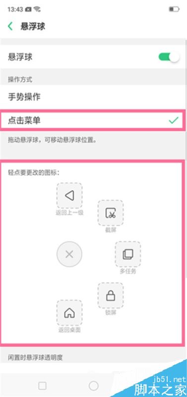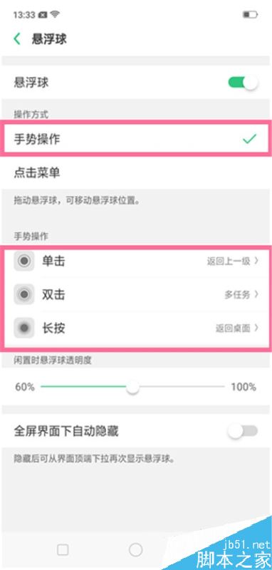 4、打开【悬浮球】开关,还可以进行进一步设置。如将操作方式设置为【手势操作】,手势操作包括:单击是返回上一级、双击是多任务、长按是返回桌面。