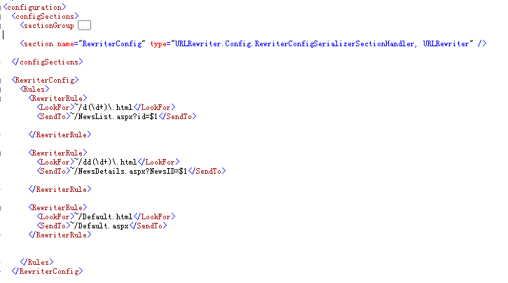 要注意的就是其中的<LookFor></LookFor>和<SendTO></SendTO>节点,写到LookFor节点中的URL路径是对外公布的URL路径,而SendTO节点中的URL路径则是IIS进行解析的时候返回的真实的路径。上图中节点一部分就是只要是类似字母d后面跟数字的都交给NewsListaspx带参返回解析;而节点二部分就是只要是类似字母dd后面跟数字的都交给NewsDetails.aspx带参返回处理;而节点三就是把html请求页面转为aspx请求返回。