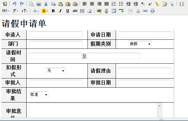 上图的HTML是强制定义的,像table>tbody>tr>td必须按照这个格式定义,虽然不灵活,但是功能也算实现了。说说思路:这个表单将解析成11个节点(申请人、申请日期、部门、假期类别、请假时间、扣薪形式、请假理由、审批人、审批日期、审批结果、审批意见)