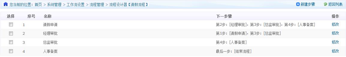 上图是一个请假流程的全部步骤,下面介绍怎么制定这些步骤。