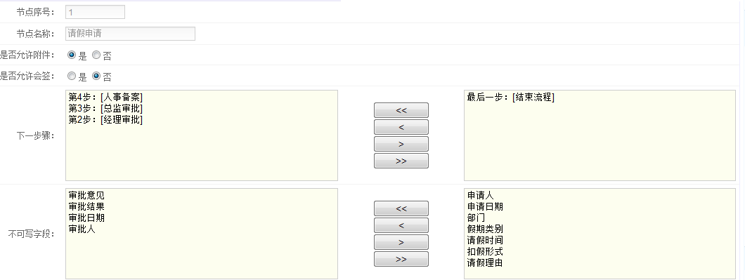 节点序号:用来表示当前流程为第几步,节点名称用来标识当前步骤名称,是否允许附件、会签,用来控制附件与会签区的显示和隐藏。下一步标识当前步骤可以流转到哪些步骤,左边是已经选择好了的(可以是多个步骤,这里考虑的是,不同的职位使用相同的流程会有特殊情况发生,譬如正常的流程是需要四步[员工填写》经理审批》总监审批》人事备案],但是当总监请假的时候就不需要这么多步骤[填写表单》人事备案]),右边是拉取当前流程下的所有步骤。不可写字段标识,当前步骤时,表单有哪些节点为不可以填写,譬如:员工填写请假申请单,流转到经理时,那么经理看到的表单就有员工姓名、部门等信息不能填写,只能填写审批意见等节点信息。这样流程与表单就关联好了,接下来就是工作流流转了。