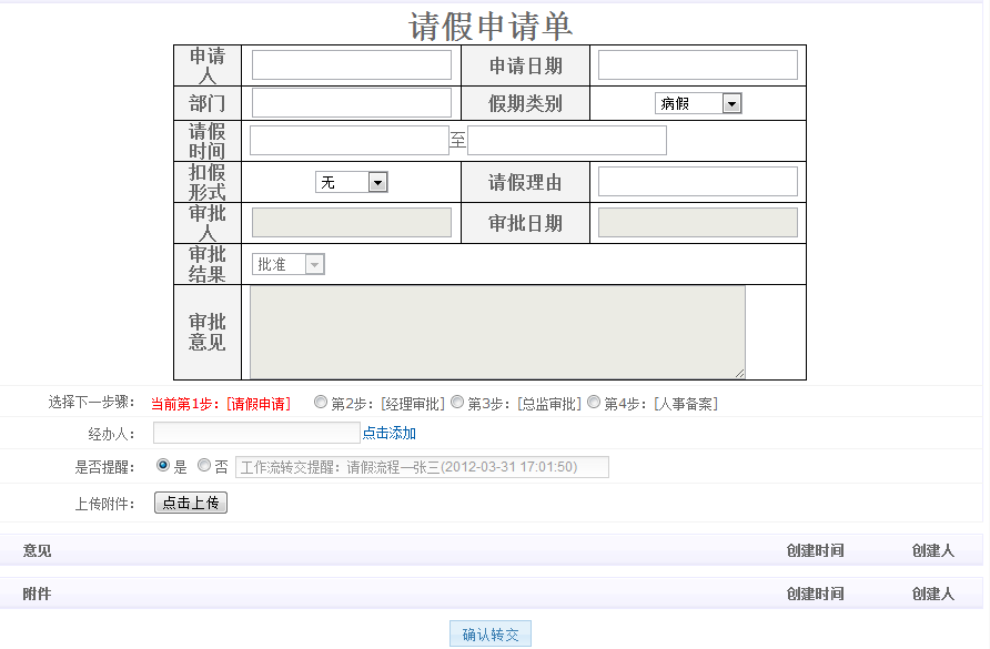 然后填写表单内容,选择下一个步骤及经办人就可以流转至下一步。说明:表单内容我是把整个表单的HTML代码全部存入数据库,然后流程流转时再把填写好的表单内容存入下一步,这样流程到下一步时,看到的表单就是最新的了。这是一个很笨的办法,因为使用$("#表单tableID")是获取不到表单的value值的,所有需要进行处理,获取表单内容通过jquery直接attr(value,文本值)上去,这样就可以把表单内容存入数据库。