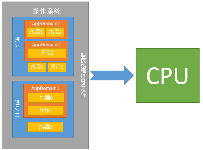 下图是大体描述进程、AppDomain和线程的关系,以及操作系统对线程的调度。详细内容本文不做进一步说明。