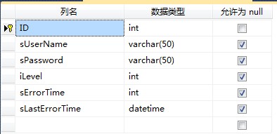 SELECT ID, iLevel, sErrorTime, sLastErrorTime, sPassword, sUserName FROM T_userInfo WHERE (sUserName = @sUserName)