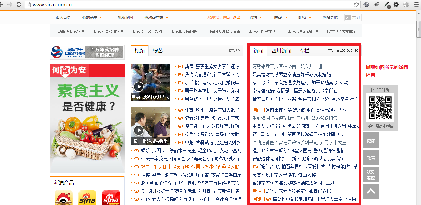 抓取新浪网的新闻栏目,如图所示: