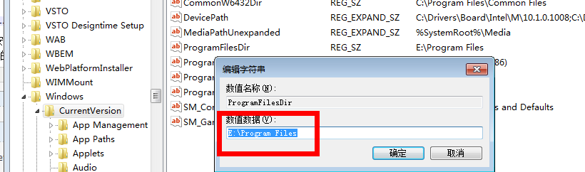 这个时候可以先撤销安装。通过CMD命令运行regedit。展开HKEY_LOCAL_MACHINE\Software\Microsoft\ Windows\ CurrentVersion分支,在窗口的右侧区域找到名为“ProgramFilesDir”的键值,将其原键值“C:\Program Files”改为“X:\Program Files”,关闭注册表。