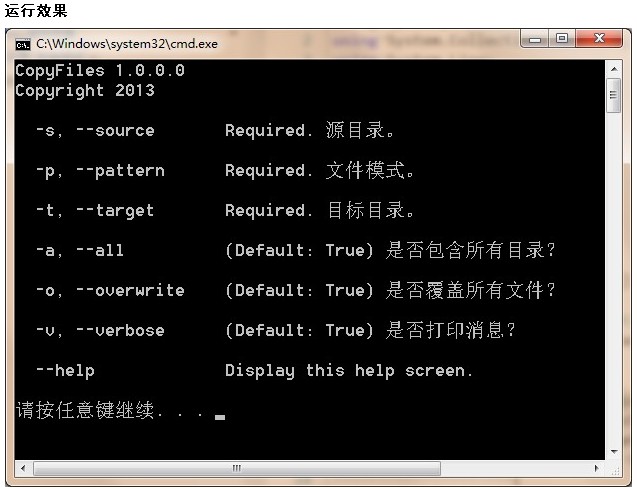 拷贝文件,如:CopyFiles -s "E:\Framework\Tenoner - 副本 (2)" -p "*.csproj" -t "E:\Framework\Tenoner - 副本 (2)\Bak",可以支持:深度拷贝、拷贝符合指定模式的文件、是否覆盖等选项。
