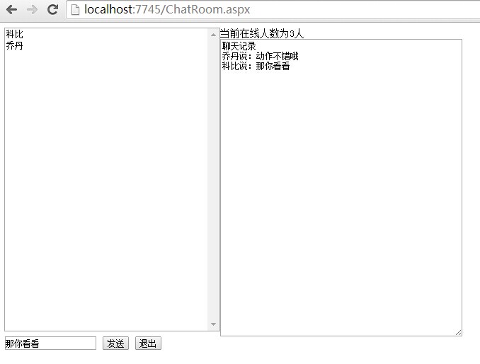 这里也要注意一点就是,在退出聊天室的时候,要把application键为”nickname”,即当前session[“nickname”]的值给remove掉。否则刷新listbox的时候,会发现退出的昵称还存在。