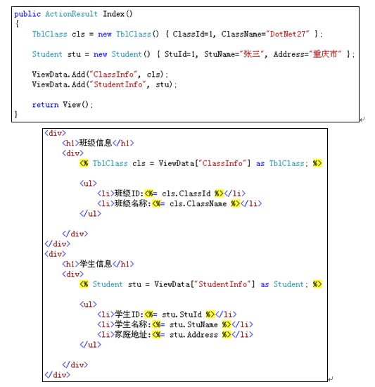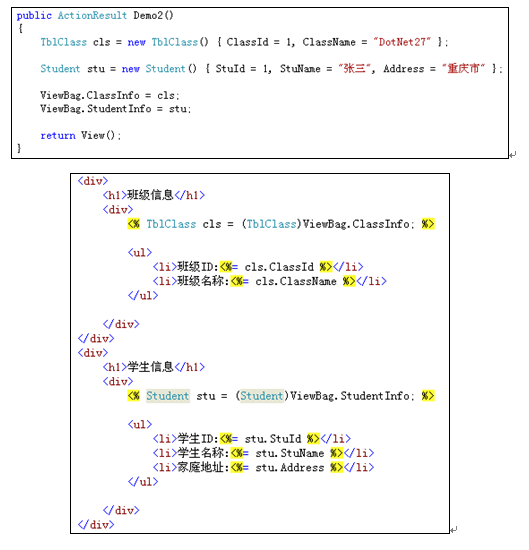 下面的代码演示了向ViewBag中存放cls和stu两个对象,这两个对象分别放到了属性ClassInfo和StudentInfo中。