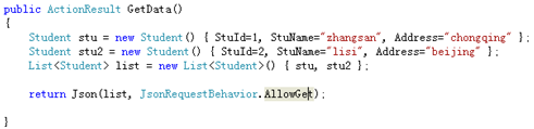 注意:默认情况下mvc拒绝响应以get方式发送的ajax请求,需要使用JsonRequestBehavior.AllowGet。