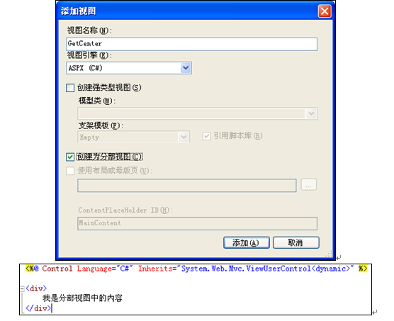 下图演示了在创建视图文件时,如何创建一个分部视图文件(勾选“创建为分部视图”复选框):