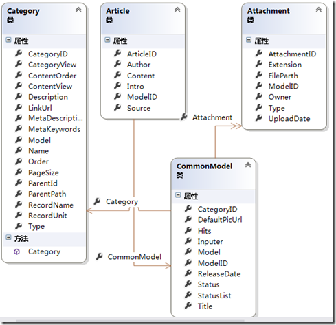 CommonModel是内容管理这块抽取出来的公共部分,像文章,咨询甚至产品都有一些共同的内容这里把它单独提取出来作为一个类。CommonModel可能包含一片文章,包含一组附件,包含一系列评论,他们之间的关系类图中已经表示出来。