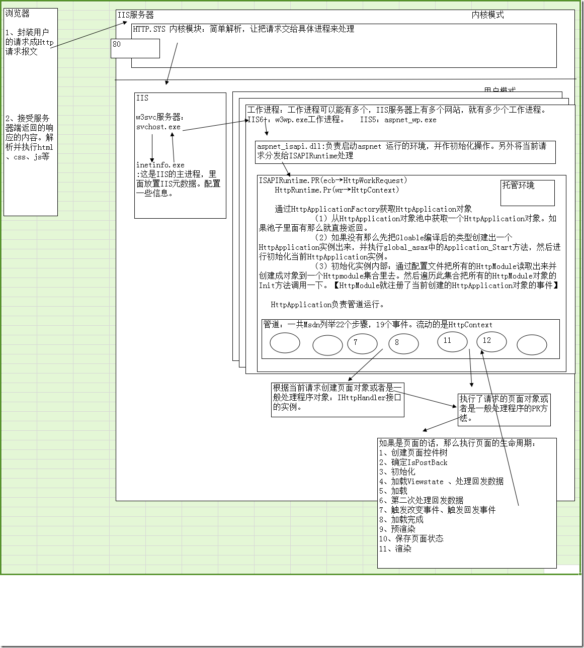 在如上所示的风光旖旎的画卷中,我们可以看到一个“请求”从客户端浏览器出发,经历千山万水到达服务器,服务器的内核模块的HTTP.SYS热情款待了它,对它进行简单的修饰之后,就和它依依惜别了,因为HTTP.SYS知道它是一个有梦想的“请求”,它应该去它该去的地方,于是就把它送到了IIS。