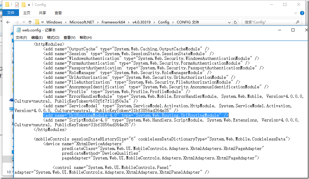 RuntimeConfig.GetAppConfig().HttpModules.CreateModules();通过这行代码,我们可以清楚的发现它读取了运行时的配置文件,那么我们打开运行时的配置文件以观究竟。
