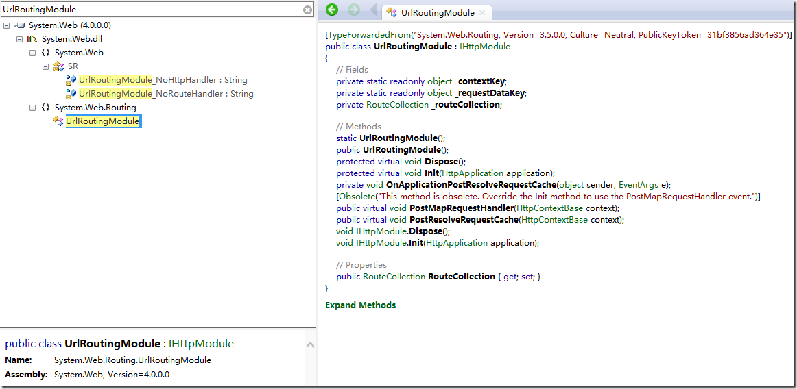果然在这里add了一个System.WebRouting.UrlRoutingModule类型。接下来我们再用反编译工具看这个类型的源码: